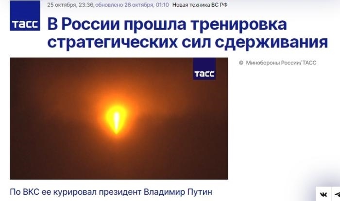 中新網10月27日電 據塔斯社報道,當地時間25日,在俄軍最高統(tǒng)帥、俄總統(tǒng)普京的指揮下,俄羅斯武裝部隊進行了戰(zhàn)略核威懾力量演習。