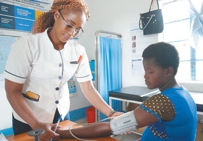 穆薩烏(左)為一名當(dāng)?shù)卦袐D測量血壓。本報(bào)記者 黃煒鑫攝