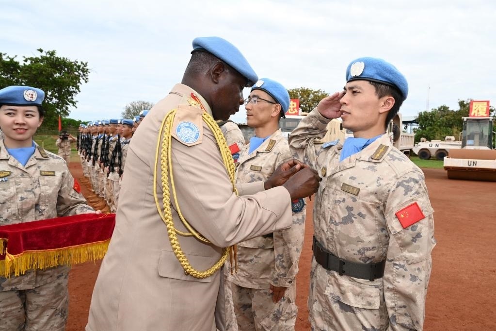 2023年10月28日,在聯(lián)合國駐南蘇丹特派團瓦烏超級營地的中國工兵營區(qū),聯(lián)南蘇團西戰(zhàn)區(qū)司令哈根(中)在授勛儀式現(xiàn)場授予中國維和官兵聯(lián)合國“和平榮譽勛章”。新華社發(fā)(李飛宇攝)
