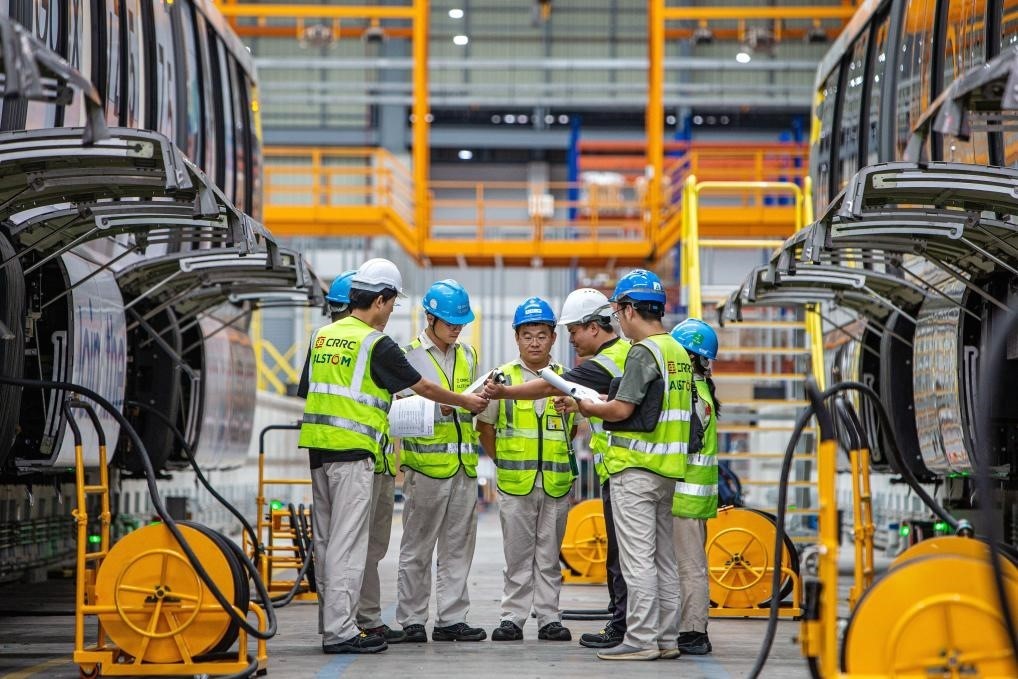 2023年9月22日,在泰國(guó)曼谷“黃線”列車(chē)維護(hù)中心,中車(chē)浦鎮(zhèn)阿爾斯通運(yùn)輸系統(tǒng)有限公司工作人員檢修列車(chē)。新華社記者王騰攝