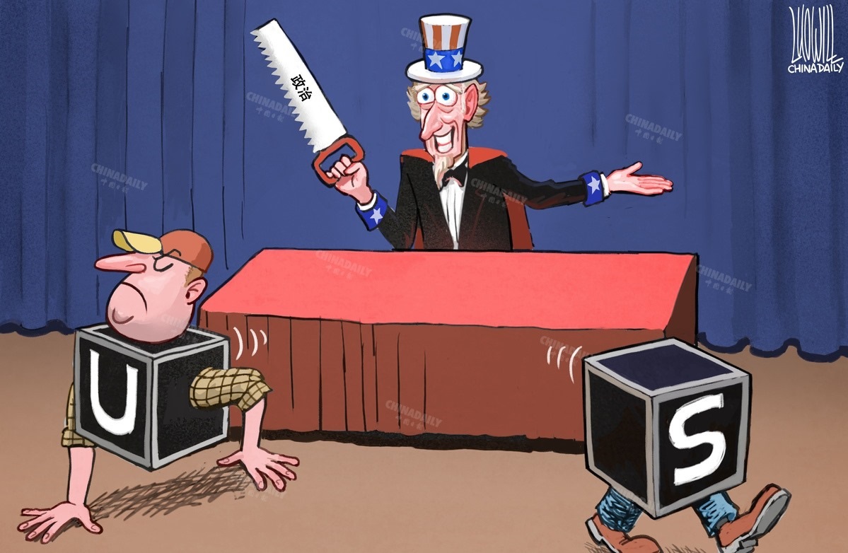 美國政治導(dǎo)致社會分裂。(來源:中國日報 作者:羅杰)