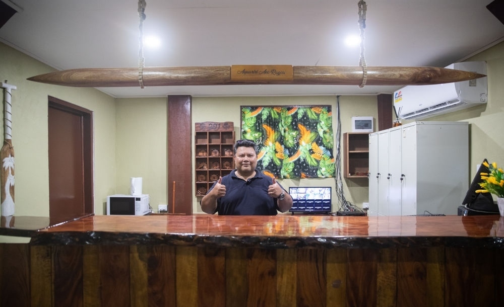 2月2日,在位于瑙魯島東南部的“阿夸里里”客棧內,客棧老板丹尼爾在向記者致意。新華社發(fā)(胡涇辰攝)