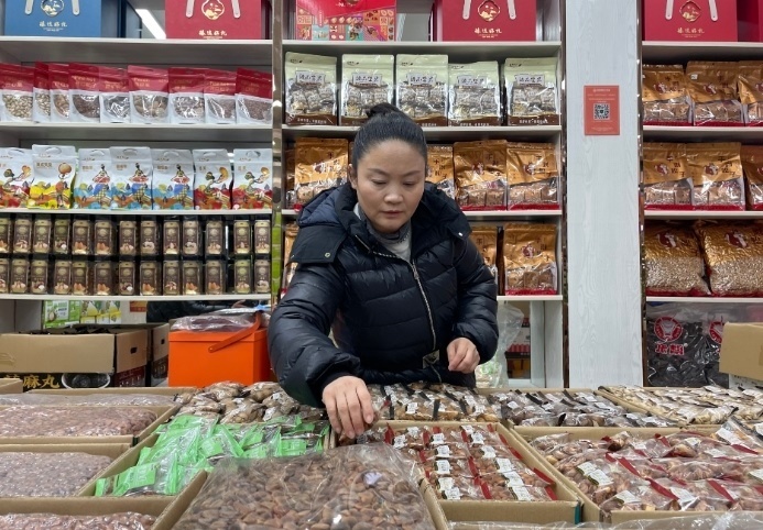 這是湖南長沙高橋大市場堅果經銷商李海麗在整理貨物。新華社記者 余春生 攝