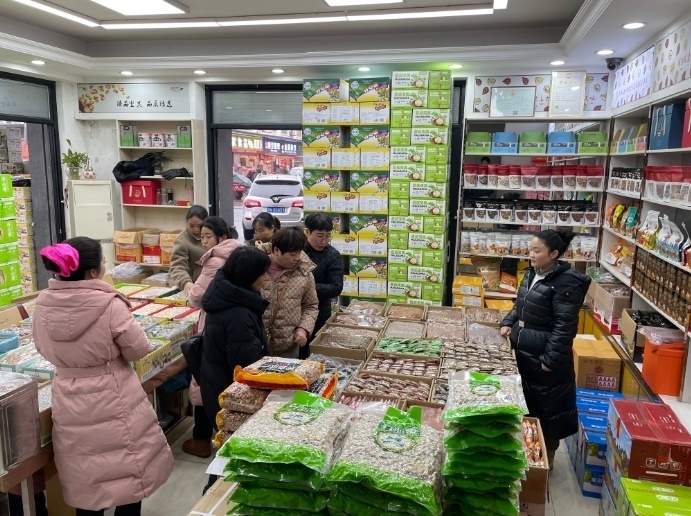 這是湖南長沙高橋大市場堅果經銷商李海麗(右一)在向顧客介紹非洲堅果。新華社記者 余春生 攝