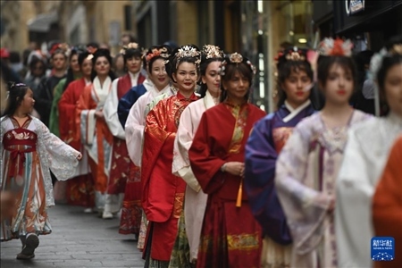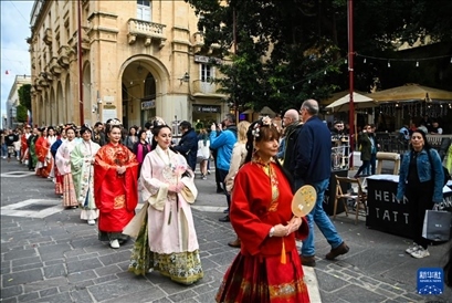 馬耳他民眾和當?shù)赜慰?7日在地中海古城瓦萊塔的街道上欣賞到一場美妙的“漢服秀”。20多名中外女性漢服愛好者身著漢服,或手持團扇,或提著宮燈,在地中海的微風中款款而行。