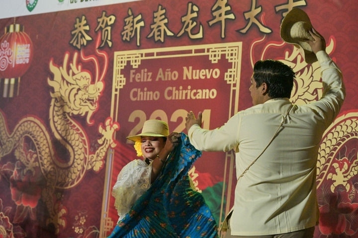 2月17日,在巴拿馬奇里基省首府戴維市,兩名身穿巴拿馬民族服飾的舞者在奇里基春節(jié)慶祝活動(dòng)上表演。新華社記者陳昊佺攝