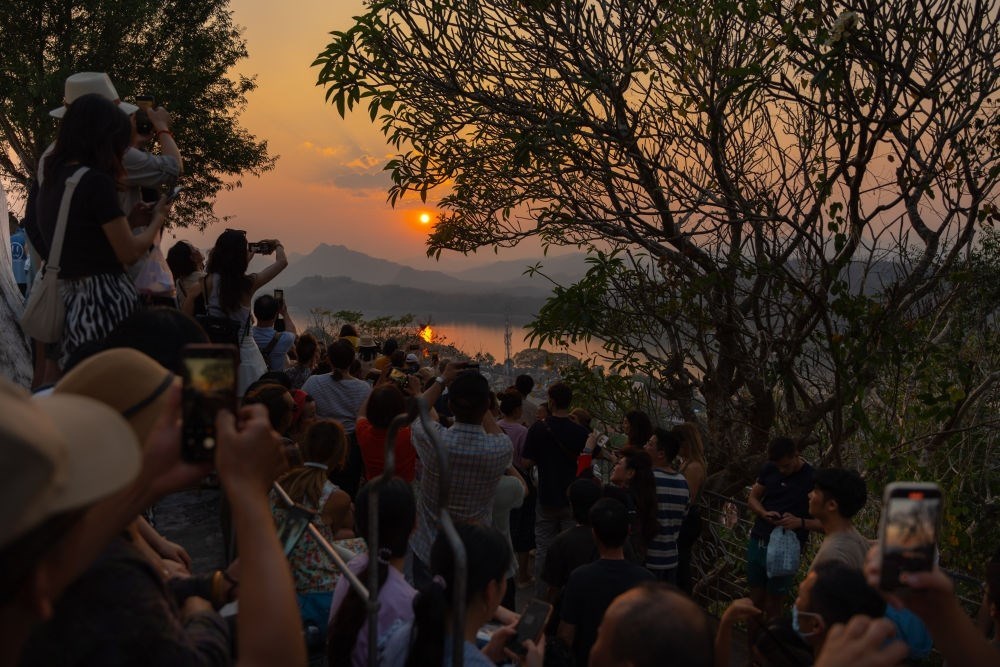 2月16日,在老撾瑯勃拉邦普西山山頂,游客在觀賞落日景觀。湄公河畔、老撾北部群山環(huán)繞的瑯勃拉邦在14到16世紀(jì)間曾是老撾歷史上第一個統(tǒng)一的多民族國家瀾滄王國的首都。瑯勃拉邦古城1995年被聯(lián)合國教科文組織列入世界文化遺產(chǎn),如今已經(jīng)成為老撾歷史與文化的象征。