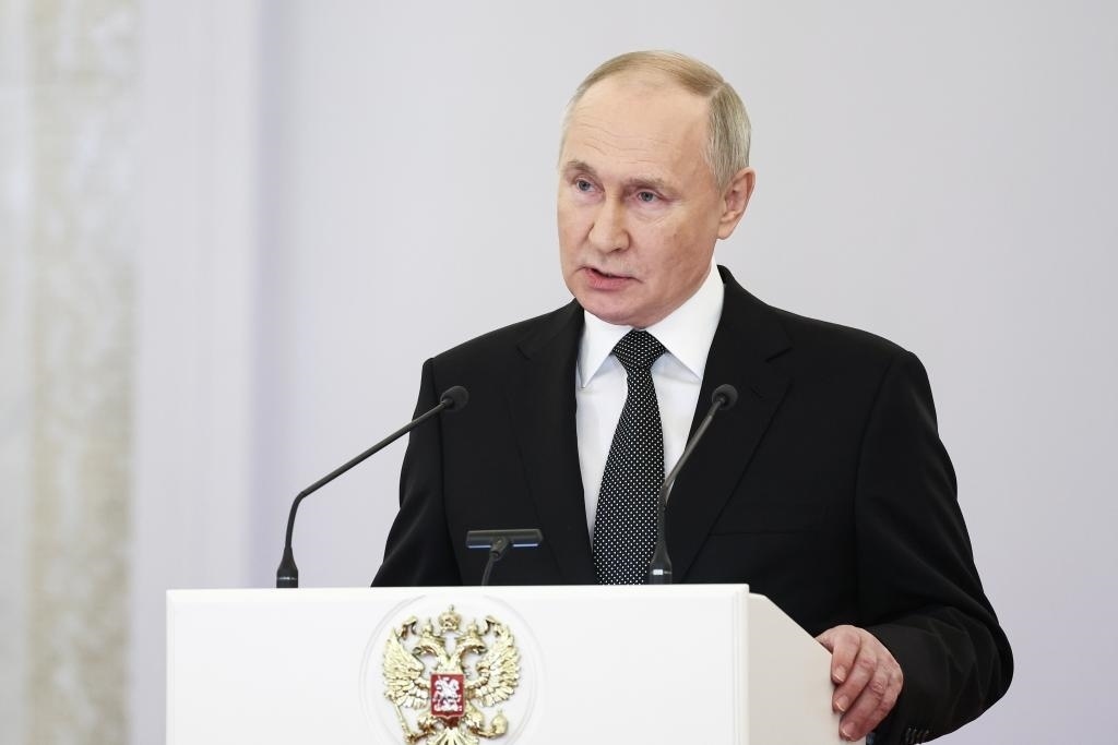 2023年12月8日,俄羅斯總統(tǒng)普京在莫斯科克里姆林宮出席“祖國(guó)英雄日”慶祝儀式。新華社/塔斯社
