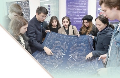 2024年3月20日,在江蘇南通市崇川區(qū)“文化崇川 游我所愛”中外文化交流活動(dòng)中,來自俄羅斯、巴基斯坦、印度尼西亞、盧旺達(dá)等國家的學(xué)生現(xiàn)場(chǎng)了解藍(lán)印花布印染技藝。許叢軍攝(人民視覺)