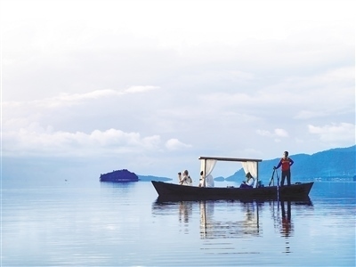 中國游客在泰國南部甲米府蘭塔島近海搭乘小船拍攝日出。