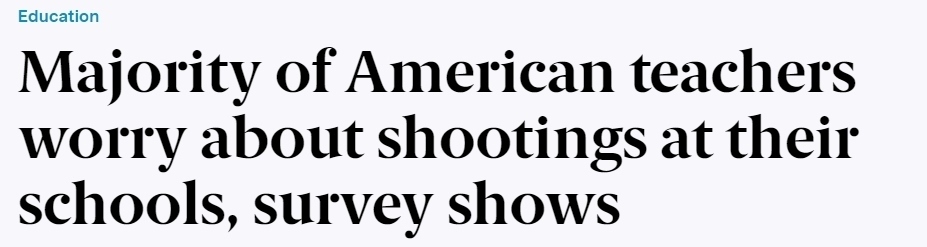 報道稱,2023年,美國發(fā)生的校園槍擊事件數(shù)量達到了歷史新高。在接受皮尤調(diào)查的受訪者中,59%的人對校園槍擊表示擔(dān)心,其中18%的人說自己對此感到“非常”或者“極度”擔(dān)心。只有7%的受訪教師稱,他們完全不擔(dān)心校園槍擊的發(fā)生。