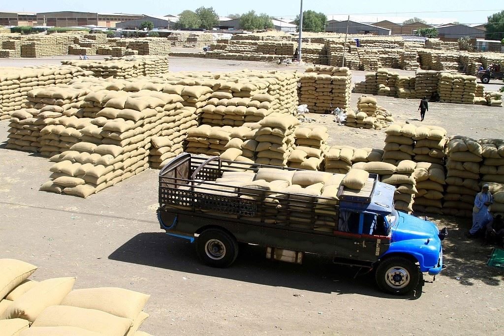當(dāng)?shù)貢r間2024年2月22日,蘇丹東部杰達(dá)雷夫市,卡車在一個市場里運送谷物。聯(lián)合國糧食計劃署表示,蘇丹長期武裝沖突導(dǎo)致當(dāng)?shù)亟^大多數(shù)人都面臨饑餓。