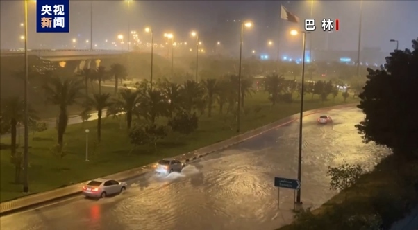 15日,暴雨、閃電和大風天氣襲擊巴林首都麥納麥,道路被洪水淹沒,車輛在沒過半個輪胎高的洪水中行駛。