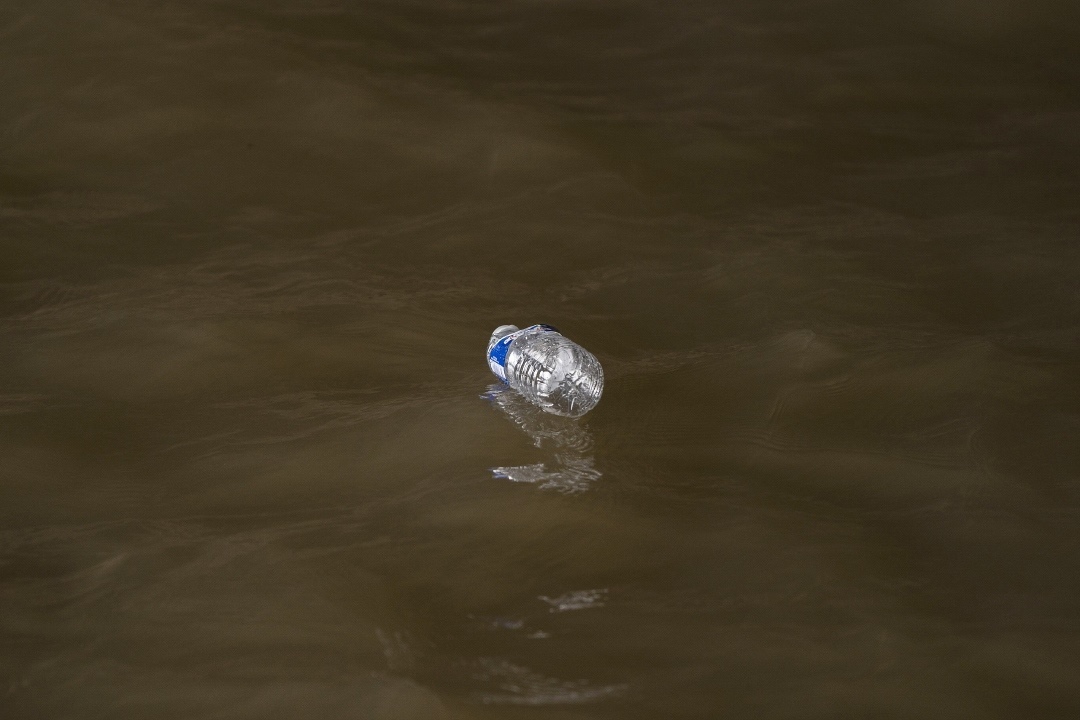 當(dāng)?shù)貢r間2024年2月14日,法國巴黎,一個塑料水瓶漂浮在塞納河的水面上。