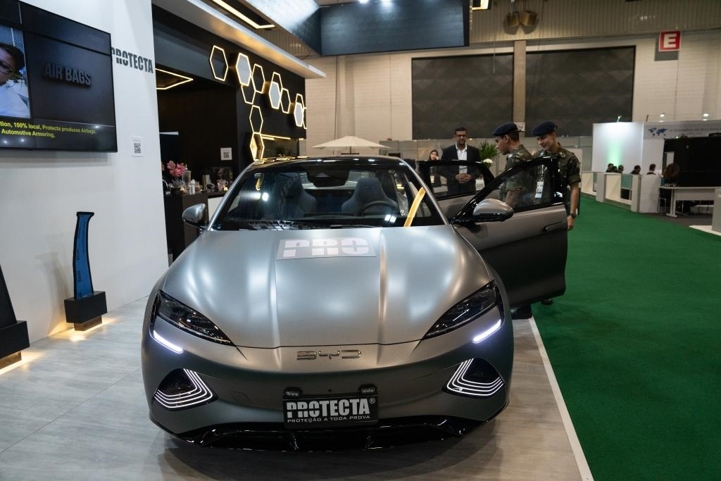 ?4月4日,在巴西圣保羅舉行的巴西防務(wù)展上,參觀者體驗(yàn)一輛經(jīng)過防彈加固的比亞迪海豹電動(dòng)汽車。新華社記者王天聰攝