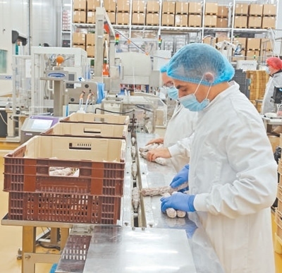 法國薩高公司香腸包裝車間內(nèi),工人們正在包裝香腸。本報記者 邢 雪攝