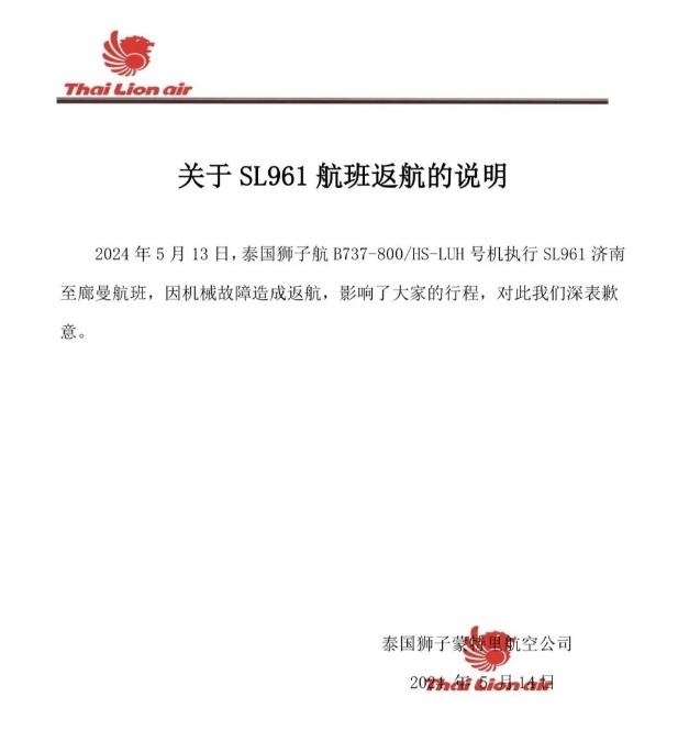 央視網(wǎng)消息:據(jù)泰國(guó)獅航公眾號(hào)消息,5月15日泰國(guó)獅航發(fā)布關(guān)于SL961航班返航的說明,2024年5月13日,泰國(guó)獅航B737-800/HS-LUH號(hào)機(jī)執(zhí)行SL961濟(jì)南至曼谷廊曼航班,因機(jī)械故障造成返航。該航司對(duì)此致歉。