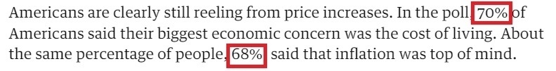 在《衛(wèi)報》發(fā)布的民意調查中,有70%的受訪者表示,他們最大的經濟擔憂是生活成本;大約同樣比例的人(68%)說,通貨膨脹是他們最關心的問題。
