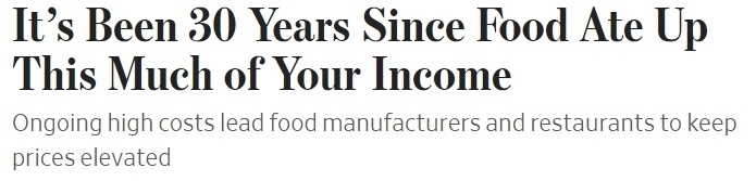 《華爾街日報》報道稱,持續(xù)的高成本導致食品制造商和餐館繼續(xù)抬高價格,“食物支出‘吃掉’這么多收入,已經是30年前的事”。