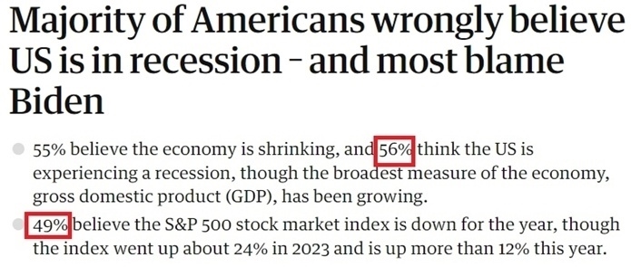 眼下美國的經濟現(xiàn)狀,被經濟學家們稱為“氛圍衰退”。這個詞最早由網紅經濟評論員凱拉 斯坎倫創(chuàng)造,用以描述人們對經濟狀況存在的悲觀情緒,即便是表現(xiàn)良好的經濟統(tǒng)計數(shù)據(jù)也無法消除這種悲觀情緒。