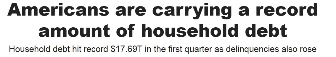 美國紐約聯(lián)邦儲備銀行公布的最新數(shù)據(jù)顯示,今年一季度,美國家庭債務總額達到17.69萬億美元(約合人民幣128萬億元),創(chuàng)下歷史新高。