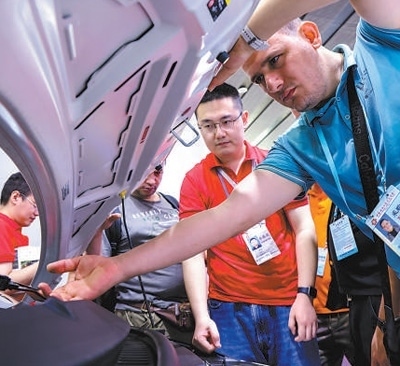 一名外國采購商在第135屆廣交會新能源汽車展區(qū)詳細(xì)了解一款車型。新華社記者 劉大偉攝
