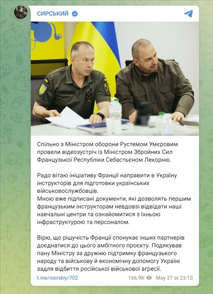 5月27日,瑟爾斯基在Telegram上發(fā)文稱,法國有意向烏克蘭派遣教官,培訓烏軍人員。