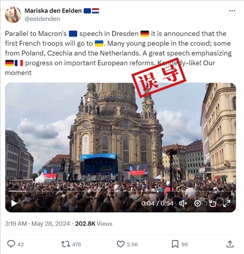 視頻顯示的內(nèi)容系馬克龍在演講開篇用德語對現(xiàn)場來賓進行問候,未提到法國軍隊。核查馬克龍在德累斯頓的演講內(nèi)容發(fā)現(xiàn),在近40分鐘的演講期間,馬克龍共有16次提到“烏克蘭”,但其中沒有內(nèi)容是與向烏克蘭派遣法國軍隊相關的。