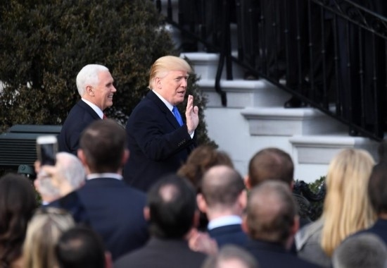 2017年12月20日,在美國華盛頓白宮,時(shí)任美國總統(tǒng)特朗普(右)和副總統(tǒng)彭斯準(zhǔn)備就國會通過稅改法案發(fā)表講話。新華社記者殷博古攝
