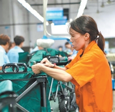 河南泰普森公司生產(chǎn)車間的工作人員正在組裝戶外小拉車。這批訂單將于10月發(fā)往美洲市場。本報記者 張文豪攝
