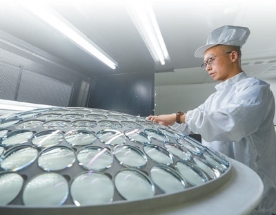 在江蘇丹陽市一家光學(xué)眼鏡有限公司,工作人員在鍍膜車間內(nèi)檢查、填裝鏡片。新華社記者 李 博攝