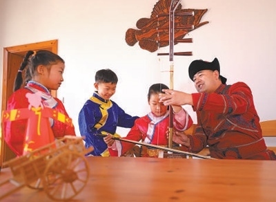 哈拉新村村民在教當(dāng)?shù)睾⒆友葑鄠鹘y(tǒng)樂器。齊齊哈爾大學(xué)孟加拉國籍留學(xué)生 衣睿實(shí)攝“在哈拉新村,我看到四弦琴造型的村口大門、魚叉狀的路燈,還有整整齊齊的‘介字房’……這里獨(dú)特的民族文化、濃郁的鄉(xiāng)土風(fēng)情,給我留下了深刻印象。當(dāng)?shù)丶缺A魝鹘y(tǒng)的達(dá)斡爾族人文特征,又開發(fā)文化體驗(yàn)館、民族特色美食等現(xiàn)代旅游資源,重視文化保護(hù)和傳承的做法值得借鑒?!?/p>
