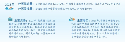 在全球范圍內(nèi),超八成的國際貿(mào)易通過海上運輸實現(xiàn),海運是中國外貿(mào)的“大動脈”?!吨袊劭谶\行分析報告(2024)》(以下簡稱《報告》)顯示,2023年,在外貿(mào)需求回暖、全球貿(mào)易體系重塑等因素推動下,中國外貿(mào)海運規(guī)模增長較快,全國沿海港口外貿(mào)吞吐量達(dá)49.6億噸,同比增長9.6%。
