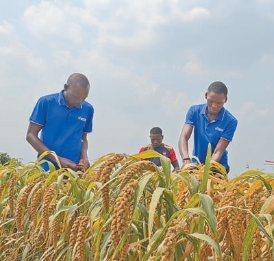 在中國(guó)—烏干達(dá)農(nóng)業(yè)合作產(chǎn)業(yè)園的試驗(yàn)田里,當(dāng)?shù)毓と苏谑斋@中國(guó)狐尾小米。龍文靖攝