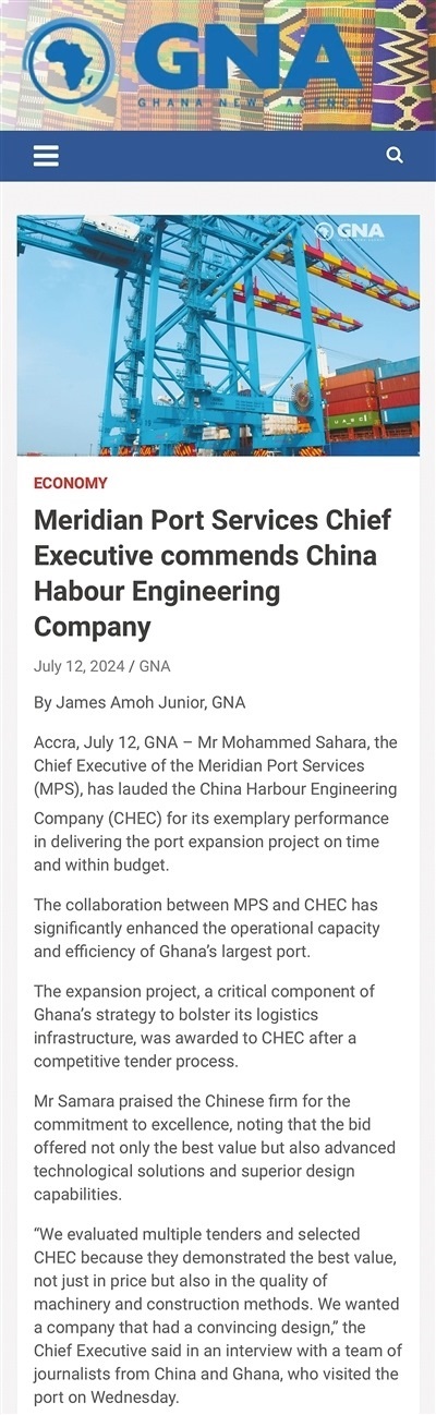 中國(guó)港灣為港口擴(kuò)建項(xiàng)目提供了先進(jìn)的技術(shù)解決方案和卓越的設(shè)計(jì)能力,并引入了多項(xiàng)創(chuàng)新技術(shù),包括能夠減少港口擁堵的停泊位窗口計(jì)劃,以及用于跟蹤和管理貨運(yùn)的先進(jìn)數(shù)字系統(tǒng),贏得了港口業(yè)主加納子午線港口服務(wù)有限公司高度肯定。——摘自加納通訊社報(bào)道