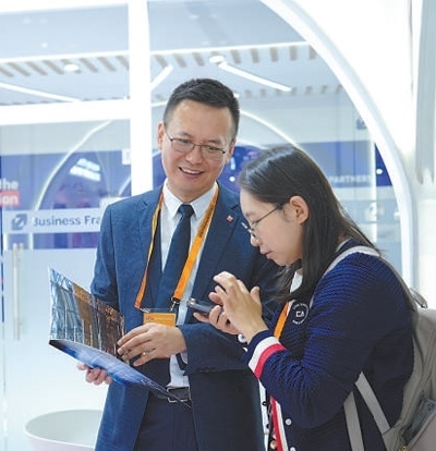 服貿(mào)會期間,法國智奧會展集團工作人員與參展觀眾洽談業(yè)務(wù)。歐陽功成攝