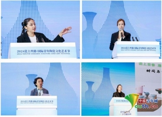 在主題演講環(huán)節(jié),四名陶瓷藝術(shù)領(lǐng)域青年藝術(shù)家代表分別上臺(tái)做了分享。土耳其青年藝術(shù)家佩琳因?qū)μ沾晌幕纳詈衽d趣而來到景德鎮(zhèn),她分享了自己對(duì)陶瓷文化的思考與理解,她認(rèn)為“陶瓷藝術(shù)飽含著人們對(duì)文化多樣性繁榮發(fā)展、美美與共的美好期許”。韓國(guó)青年藝術(shù)家宋耎姝以自己的作品《銀之?!窞槔痛蠹曳窒砹藙?chuàng)作感悟,她認(rèn)為“陶瓷藝術(shù)創(chuàng)作應(yīng)當(dāng)關(guān)注人與自然的和諧關(guān)系,從大自然中汲取養(yǎng)分”。第十二屆全國(guó)青聯(lián)委員、江西省青聯(lián)副主席、國(guó)家級(jí)技能大師工作室領(lǐng)辦人歐陽敏致力于陶瓷文化的傳播,他在分享中強(qiáng)調(diào),“陶瓷文化是中華文明與世界文明交流互鑒的橋梁和載體。各國(guó)青年應(yīng)當(dāng)做文化傳承創(chuàng)新的踐行者,充分挖掘各國(guó)歷史文化的獨(dú)特魅力和時(shí)代價(jià)值,把傳統(tǒng)文化與潮流文化融匯在陶瓷藝術(shù)的創(chuàng)作中,為共同推動(dòng)人類文明發(fā)展進(jìn)步貢獻(xiàn)青春力量?!本暗骆?zhèn)學(xué)院陶瓷美術(shù)與設(shè)計(jì)藝術(shù)學(xué)院院長(zhǎng)張博以《陶瓷藝術(shù)在空間中的應(yīng)用》為題,分享了陶瓷文化所代表的中華傳統(tǒng)文化如何與當(dāng)代潮流文化相結(jié)合,共同繪制出一幅幅五彩斑斕的人類文明畫卷。