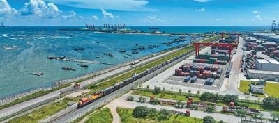 北部灣畔,開放潮涌。智能橋吊自動精準卸載貨物,無人駕駛集裝箱卡車來回穿梭;一列列滿載貨物的鐵海聯(lián)運班列駛離港區(qū);一艘艘完成裝卸作業(yè)的遠洋巨輪駛向遠方。