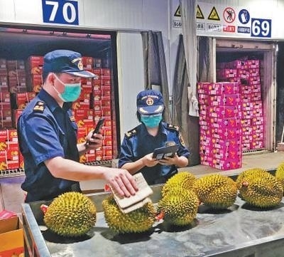 2024年8月1日,在廣西憑祥友誼關(guān)口岸海關(guān)查驗平臺,工作人員在查驗一批進口榴蓮。本報記者 牛 震攝