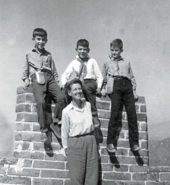 20世紀(jì)60年代,伊莎白(前)帶孩子們爬長(zhǎng)城。后排中為柯馬凱。