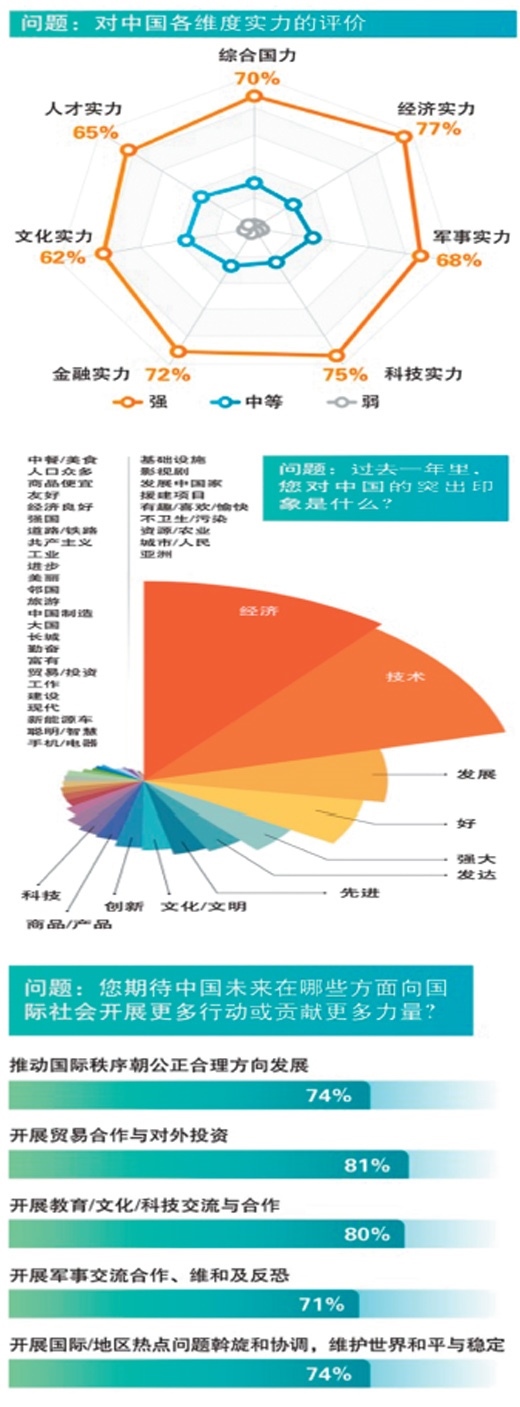 報(bào)告顯示,中國(guó)的綜合國(guó)力及各項(xiàng)實(shí)力被國(guó)外受訪民眾普遍評(píng)價(jià)為“強(qiáng)”。經(jīng)濟(jì)實(shí)力強(qiáng)獲認(rèn)可比例最高,達(dá)77%;其次為科技實(shí)力(75%)和金融實(shí)力(72%)。年輕群體對(duì)中國(guó)科技實(shí)力的評(píng)價(jià)更高。非洲國(guó)家、金磚國(guó)家、中東國(guó)家、發(fā)展中國(guó)家有超過(guò)七成民眾認(rèn)為中國(guó)綜合國(guó)力強(qiáng);該比例在東盟國(guó)家和歐洲國(guó)家超過(guò)六成,在發(fā)達(dá)國(guó)家超過(guò)半數(shù)。
