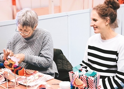 觀眾在博覽會現(xiàn)場體驗中國龍工藝品制作。