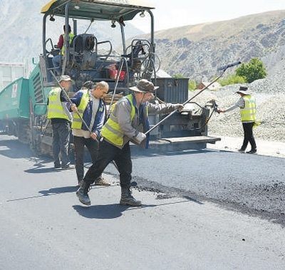 在中塔公路二期建設(shè)項(xiàng)目施工現(xiàn)場(chǎng),工作人員正在鋪設(shè)瀝青。