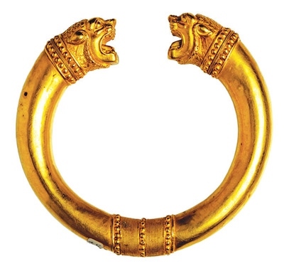 在古代伊朗文化中,環(huán)形因形似太陽,是密特拉信仰主神的象征,被賦予存在、原初、創(chuàng)世與永恒等含義。獨立展柜中陳列著一枚公元前2世紀的青銅授權(quán)環(huán)。授權(quán)環(huán)又稱“權(quán)力之環(huán)”,象征著權(quán)力的授予,授權(quán)時雙方各從一端握住它。展覽海報上的黃金獅首授權(quán)環(huán),為阿契美尼德王朝(公元前550年—公元前330年)的代表文物。