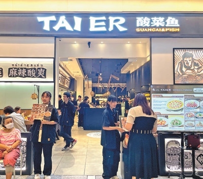 黑白色調(diào)的裝飾,開放式廚房,可愛的公仔,有趣的掛畫……太二酸菜魚在泰國的第一家店開在曼谷最繁華的一家商場,店內(nèi)的裝修風(fēng)格十分別致。記者在店員熱情的口號聲中被迎進(jìn)店里。正值晚餐高峰期,店內(nèi)座無虛席,還有人在排隊等座(見圖①,本報記者劉慧攝)?;旧厦孔蓝紩c(diǎn)一道酸菜魚。雪白的魚片被盛在一個大盤子里,配上爽脆的酸菜、金黃的菊花瓣、紅色的辣椒,酸香麻辣,令人食指大動。