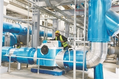 埃及新行政首都中央商務(wù)區(qū)項(xiàng)目能源中心設(shè)置的變頻空調(diào)水泵,為空調(diào)系統(tǒng)循環(huán)提供動(dòng)力,通過(guò)變頻調(diào)節(jié)實(shí)現(xiàn)節(jié)省電能的目的。圖為工作人員對(duì)水泵進(jìn)行檢查和維護(hù)。