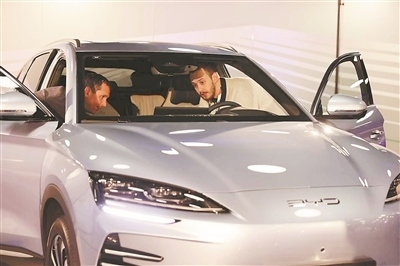 在匈牙利首都布達(dá)佩斯舉行的比亞迪某新款新能源汽車發(fā)布會(huì)上,嘉賓在了解車輛性能。