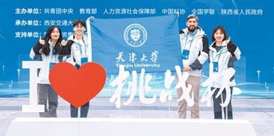 天津大學(xué)馬來(lái)西亞籍學(xué)生陳勁詠(左二)與同學(xué)參加第十四屆挑戰(zhàn)杯全國(guó)總決賽。