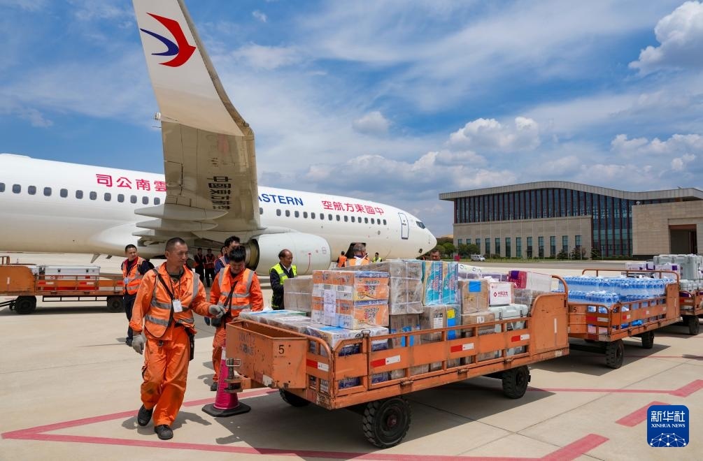 4月19日,工作人員在昆明長水機場將中國政府援緬衛(wèi)生防疫隊攜帶的物資裝機。新華社記者 陳欣波 攝