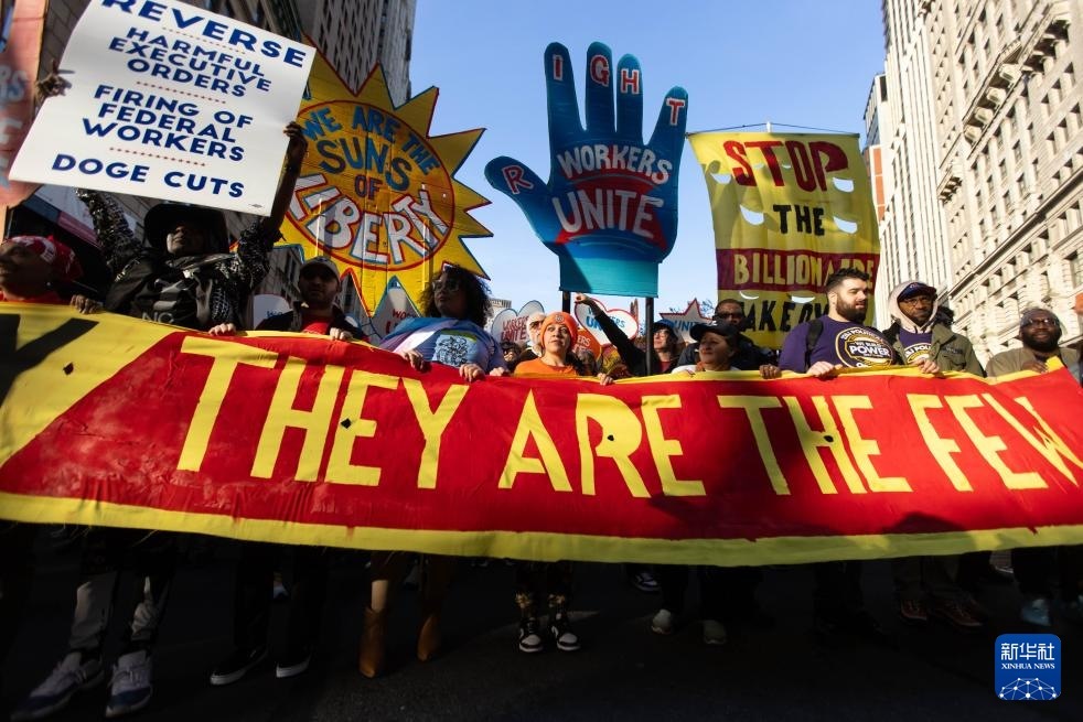 5月1日,人們手持標(biāo)語在美國紐約參加抗議特朗普政府政策的集會和游行。新華社記者 劉亞南 攝